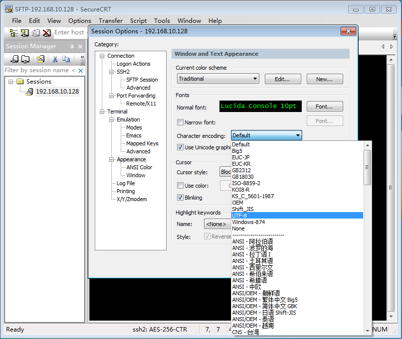 此時(shí)通過(guò)菜單Options->Session Options...打開Session Options設(shè)置對(duì)話框,左側(cè)Category中定位到Terminal->Appearance頁(yè)的Fonts區(qū),修改Character encoding的選定值為UTF-8即可: