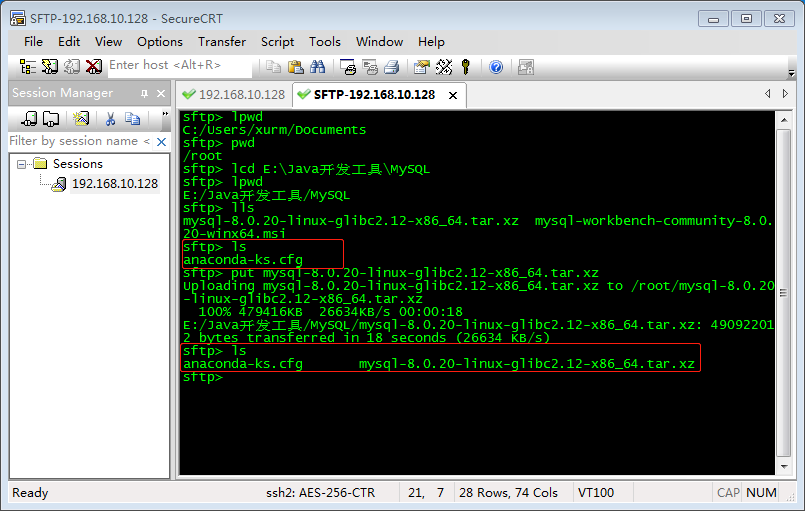 現(xiàn)在我們來(lái)嘗試一下將遠(yuǎn)程主機(jī)/root目錄那個(gè)anaconda-ks.cfg文件下載到本地當(dāng)前目錄,從遠(yuǎn)程主機(jī)下載文件的命令是 get :