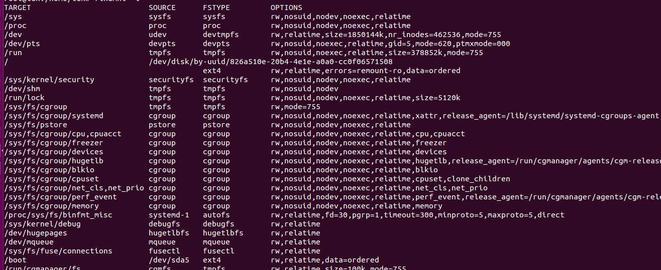 /media/13f35f59-f023-4d98-b06f-9dfaebefd6c1 /dev/sda8 ext4 rw,nosuid,nodev,relatime,errors=remount-ro,data=ordered