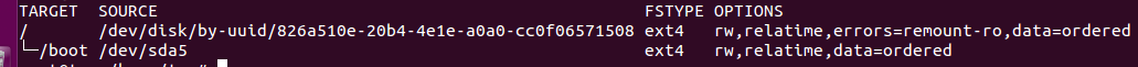 / /dev/disk/by-uuid/6fa5a72a-ba26-4588-a103-74bb6b33a763 ext4 rw,relatime,errors=remount-ro,data=ordered