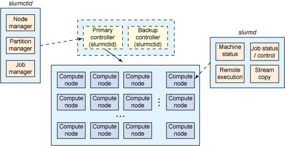 SLURM 通過(guò)一對(duì)冗余集群控制節(jié)點(diǎn)(冗余是可選的)來(lái)管理集群計(jì)算節(jié)點(diǎn),是由一個(gè)名為 slurmctld 的管理守護(hù)程序?qū)崿F(xiàn)的,slurmctld 提供了對(duì)計(jì)算資源的監(jiān)視、分配和管理,并將進(jìn)入的作業(yè)序列映射和分發(fā)到各個(gè)計(jì)算節(jié)點(diǎn)上。每個(gè)計(jì)算節(jié)點(diǎn)也有一個(gè)守護(hù)程序 slurmd,slurmd 管理在其上運(yùn)行的節(jié)點(diǎn),監(jiān)視節(jié)點(diǎn)上運(yùn)行的任務(wù)、接受來(lái)自控制節(jié)點(diǎn)的請(qǐng)求和工作、將工作映射到節(jié)點(diǎn)內(nèi)部等等。圖示如下: