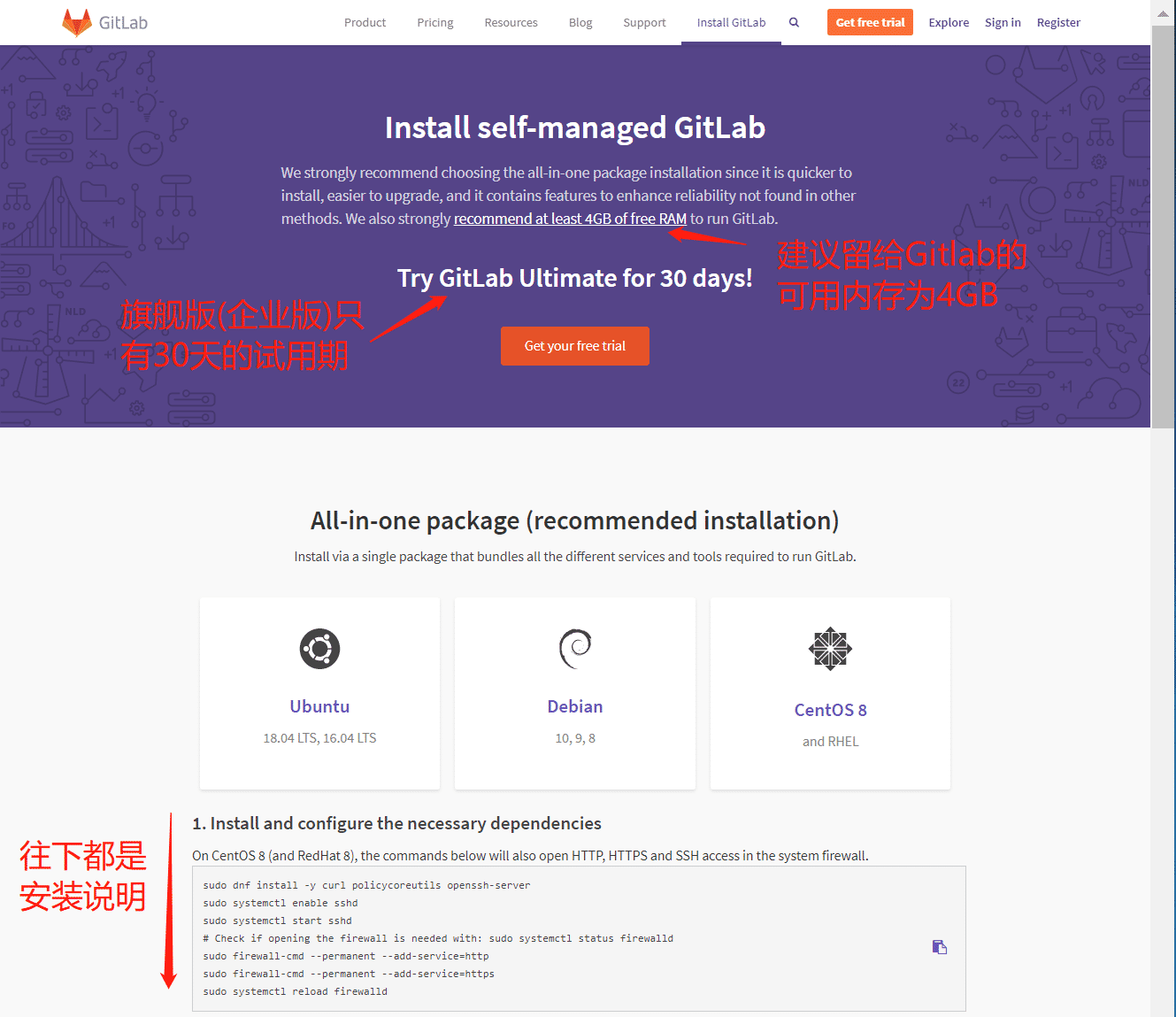還是30天試用期的旗艦版(企業(yè)版)的入口和安裝說明!不過這里有個重要的信息要留意下“recommend at least 4GB of free RAMto run GitLab”,官方建議使用至少4GB的可用內(nèi)存來運行Gitlab,那我們一會安裝虛擬機或選用服務(wù)器時就要注意了,至少要4GB以上,最好是6GB以上,因為還要留些空間給操作系統(tǒng)用!我們再點進CentOS 8的Gitlab安裝說明里,看看有沒有咱想要的社區(qū)版(GitlabCE):