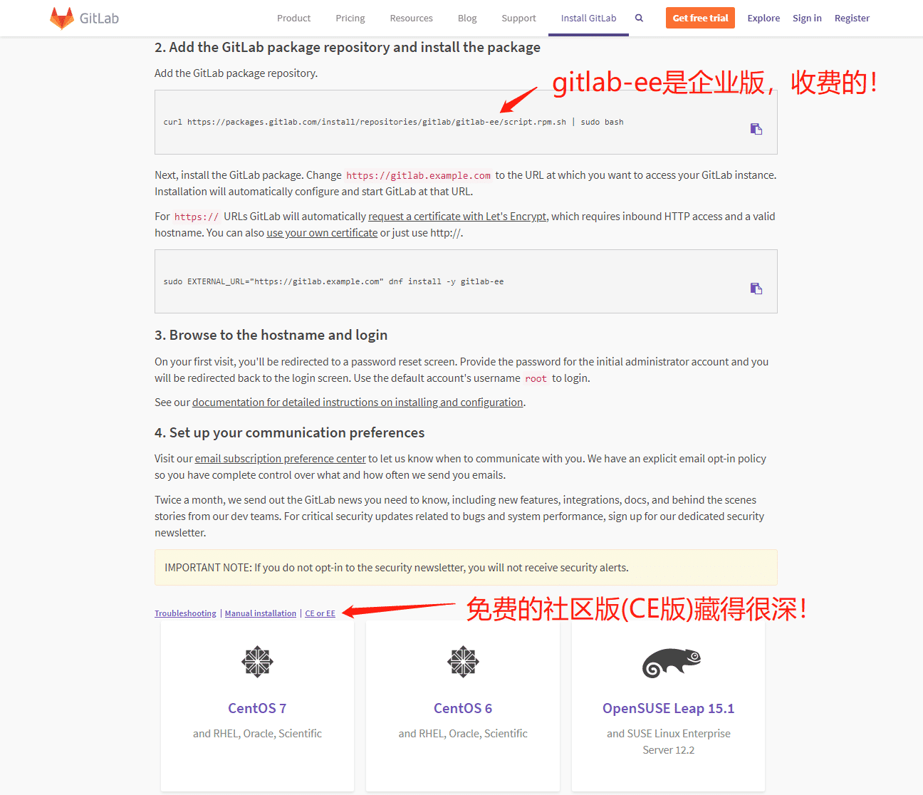新頁面前面的好幾段依然在講使用旗艦版(企業(yè)版Gitlab EE)有多少好處....直到最后才放了一個免費社區(qū)版(GitlabCE)的鏈接“Install GitLab Community Edition”,藏得這么深,這是怕別人知道??!續(xù)繼點進去: