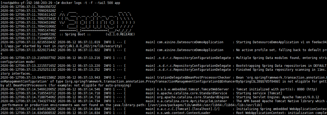 五、容器查看日志:docker logs -f -t --tail 500 app