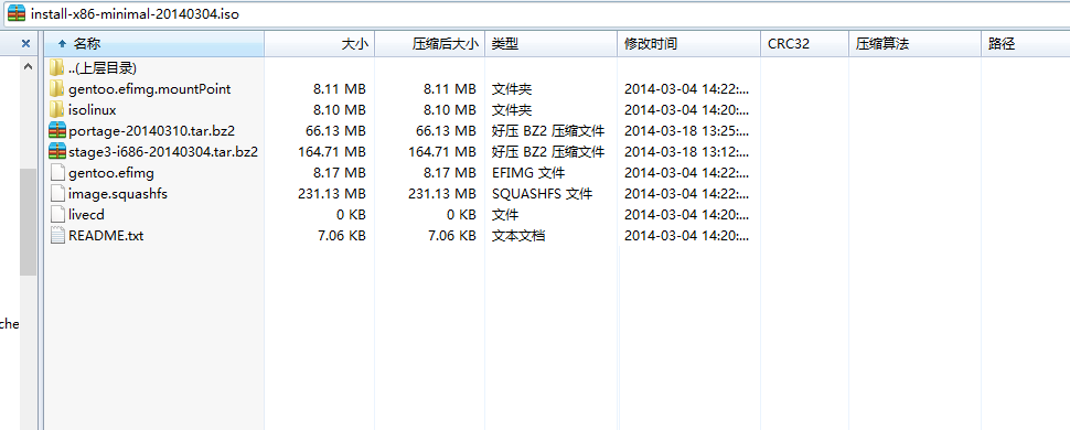 我一般的安裝習(xí)慣是這樣的,把stage3-i486-20140318.tar.bz2和portage-latest.tar.bz2包添加到鏡像install-x86-minimal-20140318.iso中省了后邊安裝在下載麻煩,譬如我用UltraISO把那兩個(gè)包壓縮到鏡像中,如下圖結(jié)構(gòu)
