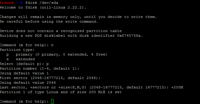 Last sector, +sectors or +size{K,M,G} (2048-16777215, default 16777215): +200M #200M boot