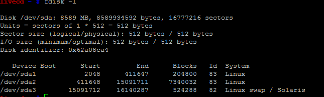 fdisk -l #查看可以分區(qū)的硬盤和容量,我測(cè)試的用8G,sata的