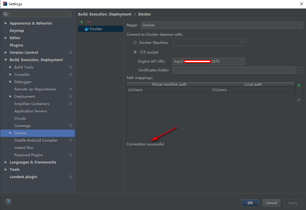 2、配置連接遠程docker,打開Docker插件,新建連接,在Engine API URL處輸入服務(wù)器IP地址:2375,然后,不出意外,下方都會出現(xiàn)Connection successful,這樣連接遠程服務(wù)器的Docker就成功了