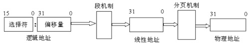 IA32的內(nèi)存尋址機(jī)制完成從邏輯地址—線性地址—物理地址的轉(zhuǎn)換。其中,邏輯地址的段寄存器中的值提供段描述符,然后從段描述符中得到段基址和段界限,然后加上邏輯地址的偏移量,就得到了線性地址,線性地址通過(guò)分頁(yè)機(jī)制得到物理地址。