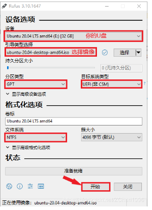 插入U(xiǎn)盤, 運(yùn)行 rufus-3.10.exe,按照下面選擇,然后點(diǎn)擊開(kāi)始,等待完成即可