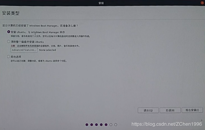選擇安裝類型,安裝Ubuntu,與 Windows Boot Manager 共存(好多安裝教程不建議選擇此項(xiàng),說(shuō)有問(wèn)題,反正從16.04開(kāi)始我都是這么裝的,沒(méi)出問(wèn)題),網(wǎng)上也有好多選擇其他選項(xiàng)安裝的,如需要可自行查找,反正我是嫌麻煩(主要是懶)不想自己分區(qū)。