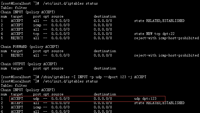 [root@localhost ~]# /sbin/iptables -I INPUT -p udp --dport 123 -j ACCEPT