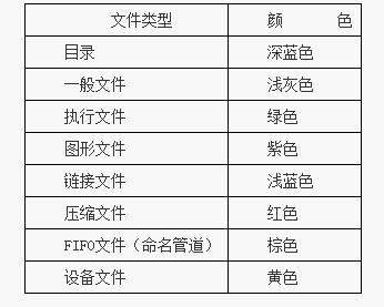 ls(list的縮寫)命令可以列出當(dāng)前目錄的內(nèi)容。dir命令是ls命令的一個(gè)別名,也是directory的縮寫。通常列出的文件會(huì)以不同的顏色進(jìn)行顯示,不同的顏色代表不同的文件類型,下表列出了文件類型與顏色的對(duì)應(yīng)關(guān)系。