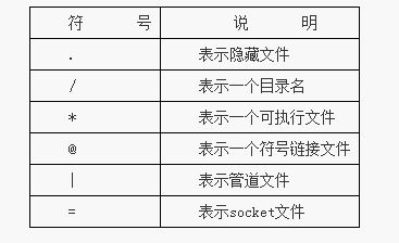 ls還會(huì)對(duì)特定類型的文件用符號(hào)進(jìn)行標(biāo)識(shí),下表列出了常用的標(biāo)識(shí)符號(hào)及其說(shuō)明。