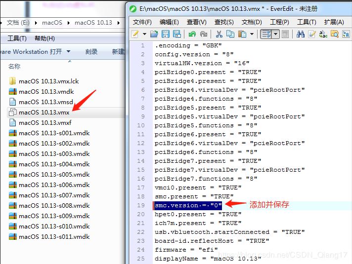 先別打開虛擬機,找到macOS虛擬機的安裝目錄,用記事本打開macOS10.13.vmx添加并保存。