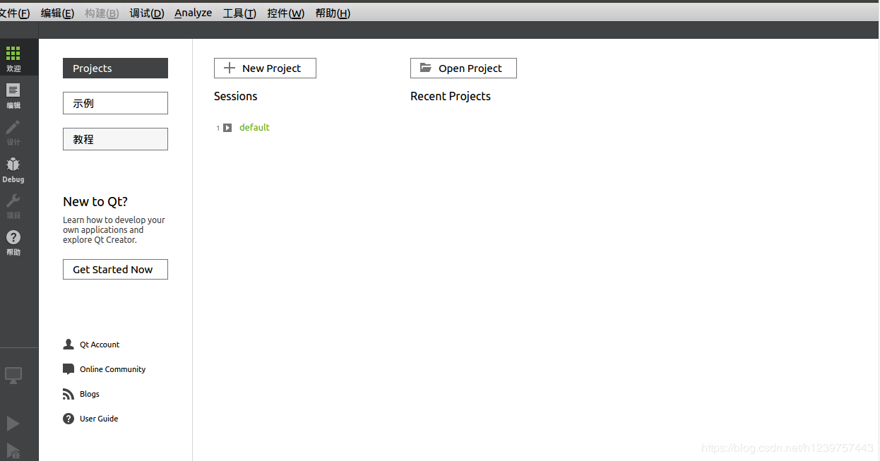 在/opt/Qt5.9.0/Tools/QtCreator/bin(這是我的安裝路徑)文件夾下找到qtcreator,雙擊打開qt creator,會(huì)出現(xiàn):