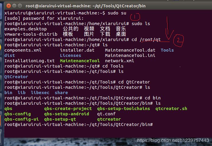 第一步,在終端輸入sudo su,然后輸入cd /qt5(若不是存在home中,那么直接輸入這個(gè),不用進(jìn)入root。接著如上圖所示操作.