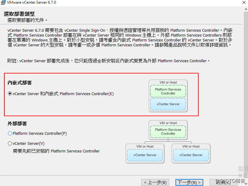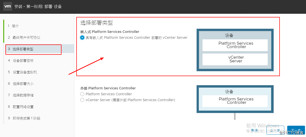 第三個(gè):跟上面的很相似,選擇部署的類型。還是選擇嵌入式PSC部署vCenter。下一步。