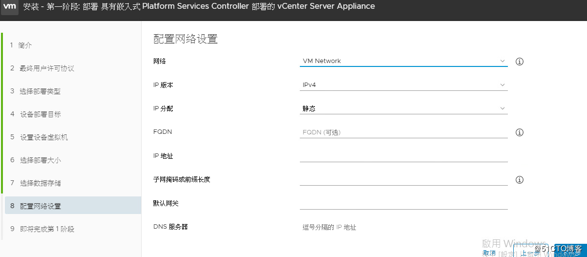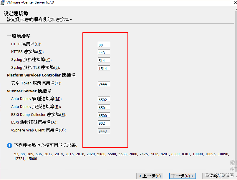 第八個(gè):配置網(wǎng)絡(luò),F(xiàn)QDN因?yàn)镈NS解析不了,還是填入IP地址,而IP地址,選用一個(gè)沒有占用的IP地址用于作為VCenter的IP地址。然后填入子網(wǎng)掩碼,網(wǎng)關(guān),DNS,常用端口不動(dòng),完。繼續(xù)下一步。