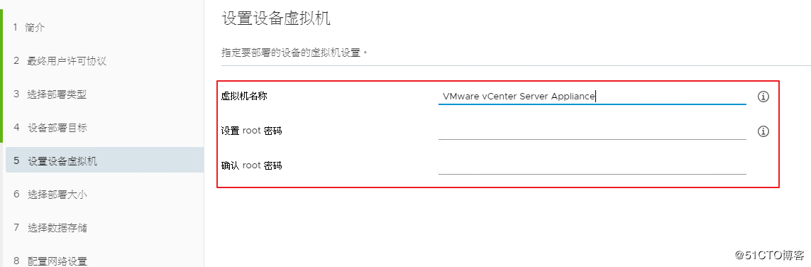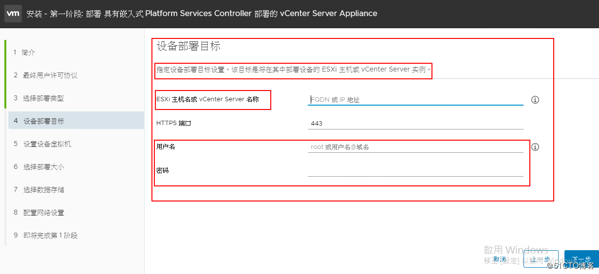 第四個(gè):這步很重要,第一項(xiàng),ESXi 主機(jī)或vCenter名稱,很讓人迷惑。其實(shí)這一項(xiàng),填入的是你的ESXi IP,意思就是你的vCenter要部署到哪臺(tái)ESXi 上。 當(dāng)然了,所以下面用戶名及密碼也是填寫ESXi 的賬密