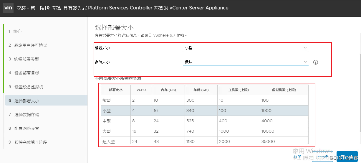第六個(gè):部署大小,它下面有個(gè)參考選項(xiàng),你選擇什么樣的大小規(guī)格,你建制出來的虛擬機(jī)規(guī)格就不一樣。一般公司小型就夠了,我公司大概是260多臺(tái)虛擬機(jī)。存儲(chǔ)大小也是默認(rèn)就好了。