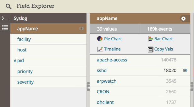 用日志管理系統(tǒng)自動(dòng)解析日志,然后在需要的應(yīng)用名稱上點(diǎn)擊過濾。下面是在 Loggly 日志管理服務(wù)中提取 syslog 域的截圖。我們對(duì)應(yīng)用名稱 “sshd” 進(jìn)行過濾,如維恩圖圖標(biāo)所示。