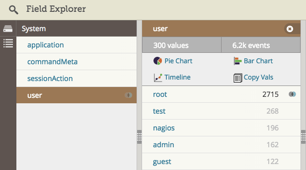 日志管理系統(tǒng)可以使用自動(dòng)解析功能從 Linux 日志中提取用戶名。這使你可以看到用戶的信息,并能通過(guò)點(diǎn)擊過(guò)濾。在下面這個(gè)例子中,我們可以看到,root 用戶登錄了 2700 次之多,因?yàn)槲覀兒Y選的日志僅顯示 root 用戶的嘗試登錄記錄。