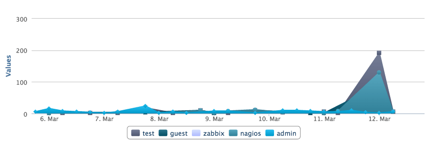 日志管理系統(tǒng)也可以讓你以時(shí)間為做坐標(biāo)軸的圖表來(lái)查看,使你更容易發(fā)現(xiàn)異常。如果有人在幾分鐘內(nèi)登錄失敗一次或兩次,它可能是一個(gè)真正的用戶而忘記了密碼。但是,如果有幾百個(gè)失敗的登錄并且使用的都是不同的用戶名,它更可能是在試圖攻擊系統(tǒng)。在這里,你可以看到在3月12日,有人試圖登錄 Nagios 幾百次。這顯然不是一個(gè)合法的系統(tǒng)用戶。