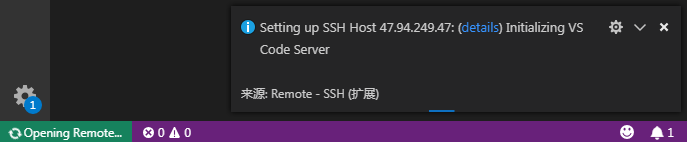 首次登錄后,VS Code會自動彈出一個新的窗口用于遠(yuǎn)程工作,并且會自動在遠(yuǎn)程主機上安裝VS Code server: