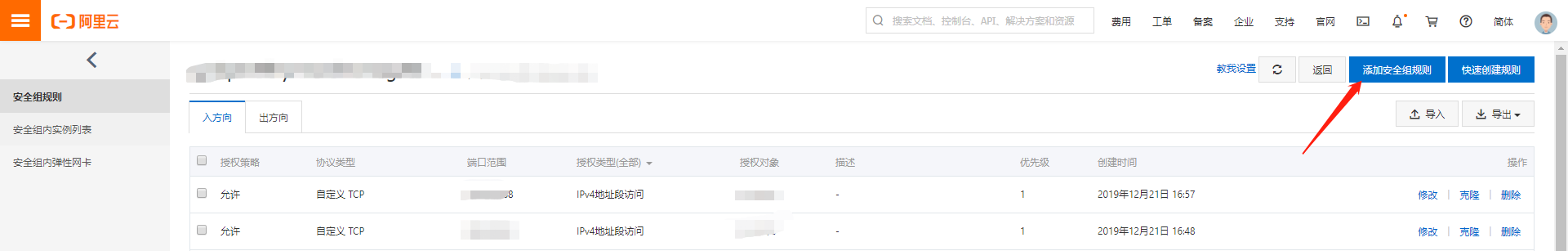 因?yàn)椴┲饔玫氖前⒗镌?,所以這里就只介紹下阿里云如何開放端口,按著下面三張圖來操作就行嘞