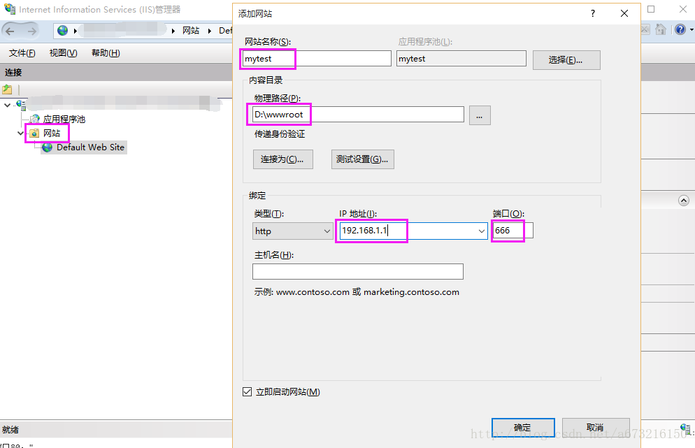 7、打開(kāi)“Internet信息服務(wù)(IIS)管理器”,創(chuàng)建自己的站點(diǎn),右擊“網(wǎng)站”>“添加網(wǎng)站”,設(shè)置如下圖,即可添加成功名稱為“mytest”的網(wǎng)站。