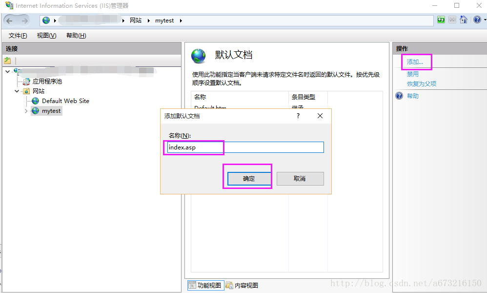 8、將index.asp作為默認(rèn)文檔。選中“mytest主頁(yè)”下方的“默認(rèn)文檔”,右擊“打開(kāi)功能”,添加默認(rèn)文檔。