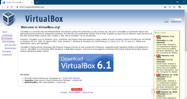 首先進(jìn)入VirtualBox官方網(wǎng)站進(jìn)行軟件下載, https://www.virtualbox.org/,目前VirtualBox最新的版本為6.1,詳細(xì)如下圖: