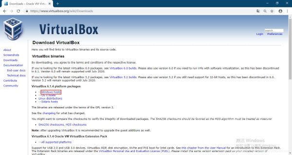 點(diǎn)擊“Downloads”按鈕,即跳轉(zhuǎn)自“VirtualBox 6.1.4 platform packages”下載頁面