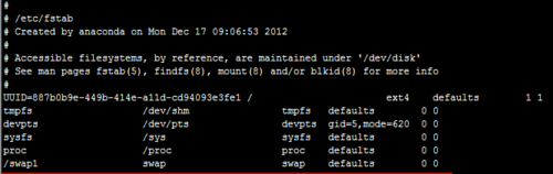 6、設(shè)置開(kāi)機(jī)啟動(dòng)新創(chuàng)建的swap分區(qū),編輯”/etc/fstab”配置文件,在文件末尾添加” /swap1 swap swap defaults 0 0“