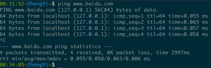 修改/etc/hosts之后,ping百度的效果如下圖所示: