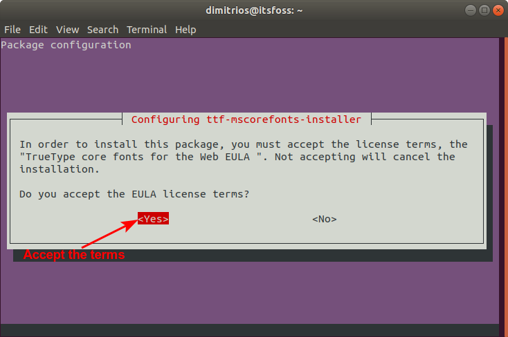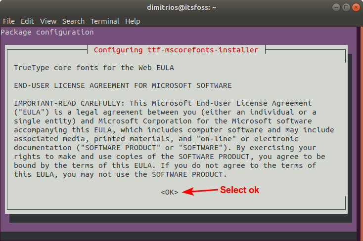 要知道盡管微軟已經(jīng)免費發(fā)布了其核心字體,在其它操作系統(tǒng)中使用該字體依然是受到限制的。在 Ubuntu 中安裝微軟字體前,你必須閱讀并接受 EULA (最終用戶許可協(xié)議) 。