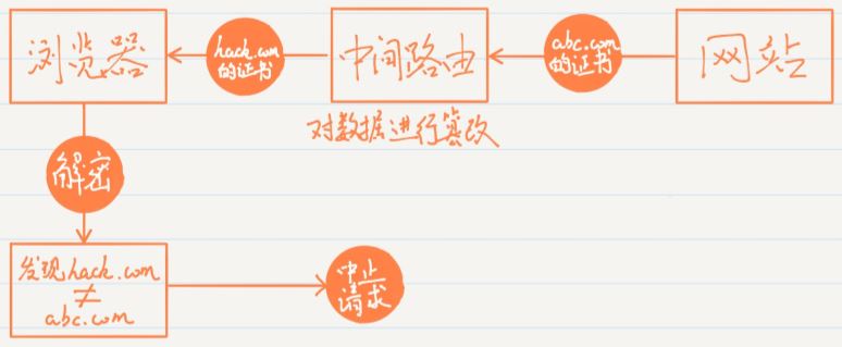 同樣是剛才的例子,如果證書(shū)中加入了網(wǎng)站的域名,那么攻擊者就只能無(wú)功而返了。因?yàn)?,即使加密?shù)據(jù)可以被成功解密,但是最終解密出來(lái)的證書(shū)中包含的域名和瀏覽器正在請(qǐng)求的域名對(duì)不上,那么此時(shí)瀏覽器仍然會(huì)顯示異常界面。示意圖如下: