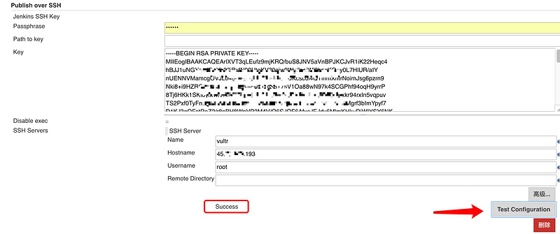 高級選項(xiàng)能夠配置ssh服務(wù)器端口和超時(shí)。Test可測試,顯示success配置成功。