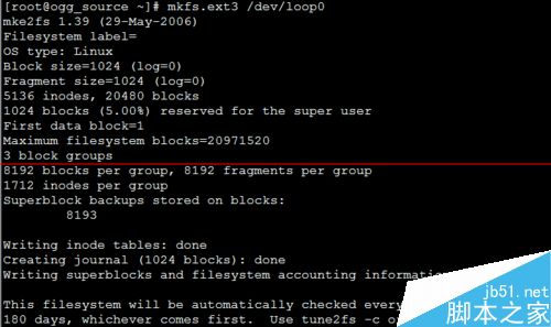 3、格式化設備:mkfs.ext3 /dev/loop0