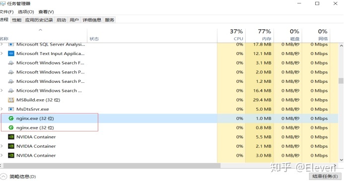 2.啟動(dòng)Nginx:直接到下載的Nginx包中雙擊打開“nginx.exe”即可,也可以通過命令啟動(dòng);命令啟動(dòng)此處不詳解;啟動(dòng)以后,打開任務(wù)管理器,會發(fā)現(xiàn)任務(wù)管理器中會有Nginx服務(wù);