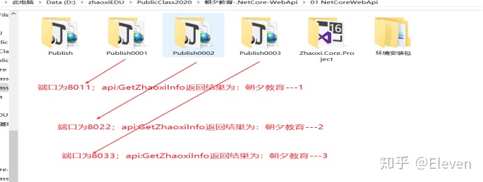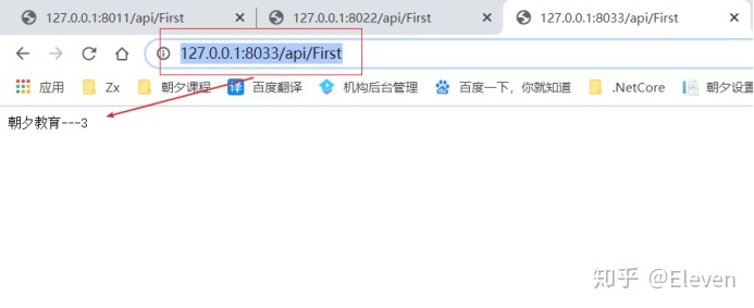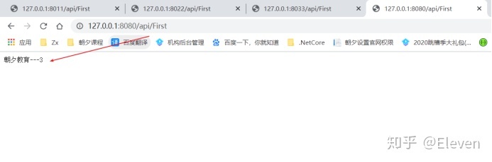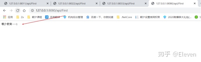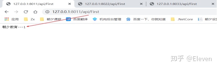 3.此時(shí)就可以使用Nginx配置負(fù)載均衡了,我先啟動(dòng)多個(gè)WebApi服務(wù)器,運(yùn)行起來,每個(gè)服務(wù)器的同一個(gè)接口返回的數(shù)據(jù)略有不同;第一個(gè)服務(wù)器的接口我返回的數(shù)據(jù)為:朝夕教育---1,第二個(gè)服務(wù)器的接口返回的數(shù)據(jù)為:朝夕教育---2,第三個(gè)服務(wù)器的接口返回的數(shù)據(jù)為:朝夕教育---3;三個(gè)服務(wù)器啟動(dòng)后的的端口分別為:8011,8022,8033;也就是說8011端口返回的是:朝夕教育---1 ;8022端口返回的是:朝夕教育---2;8033端口返回的是:朝夕教育---3;也就是說三個(gè)服務(wù)器代碼一樣的,這里返回的結(jié)果不一樣,是為了能夠測試區(qū)別。