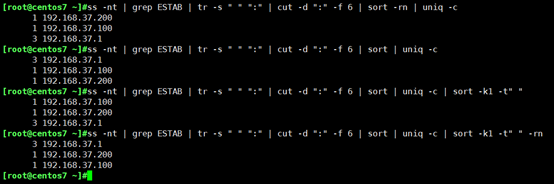 Ss可以查看本機(jī)連接數(shù),配合grep進(jìn)行篩選已經(jīng)建立連接的會話;通過tr -進(jìn)行壓縮;通過cut進(jìn)行截取相應(yīng)的列;通過sort進(jìn)行排序;通過uniq進(jìn)行去重統(tǒng)計操作;