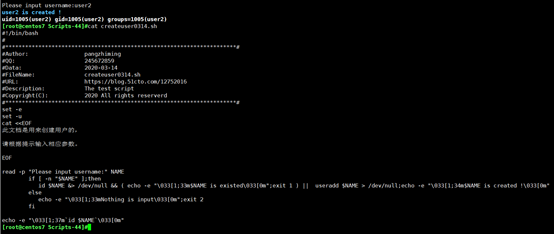 4、編寫腳本createuser.sh,實現(xiàn)如下功能:使用一個用戶名做為參數(shù),如果 指定參數(shù)的用戶存在,就顯示其存在,否則添加之;顯示添加的用戶的id號等信息;