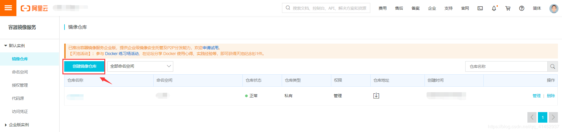 (1)在阿里云上創(chuàng)建一個(gè)自己的Docker倉(cāng)庫(kù)。