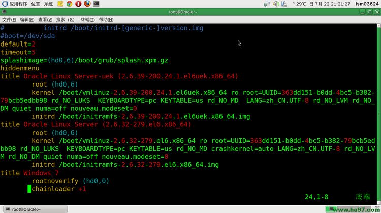 3、可以將這個(gè)值做為每次引導(dǎo)的參數(shù)。編輯/boot/grub/grub.conf文件,添加vga=0×318。