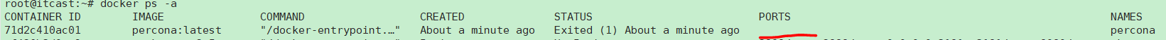 命令的參數(shù)不了解的可以看下官方文檔或者隨便搜個(gè)docker視頻教程, 都有解釋. 然后我開啟此容器, docker start percona. 開啟完后查詢所有運(yùn)行中的容器docker ps, 這時(shí)候出問題了: