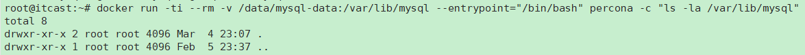 docker run -ti --rm -v /data/mysql-data:/var/lib/mysql --entrypoint="/bin/bash" percona -c "ls -la /var/lib/mysql"