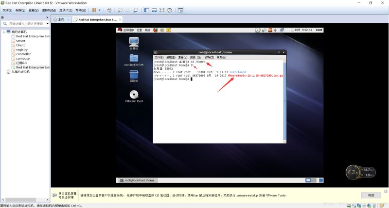 52.我們輸入命令cd /home 回車 然后在ll查看home下的文件,這時我們可以看到home下的VMware Tools
