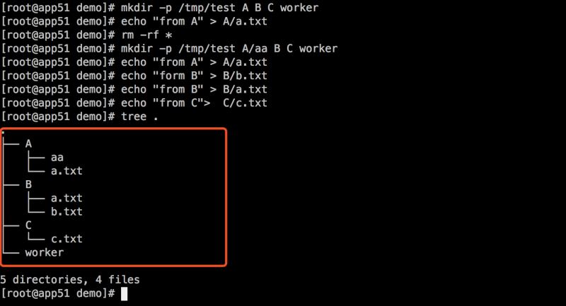 創(chuàng)建三個(gè)目錄A、B、C,以及worker目錄: